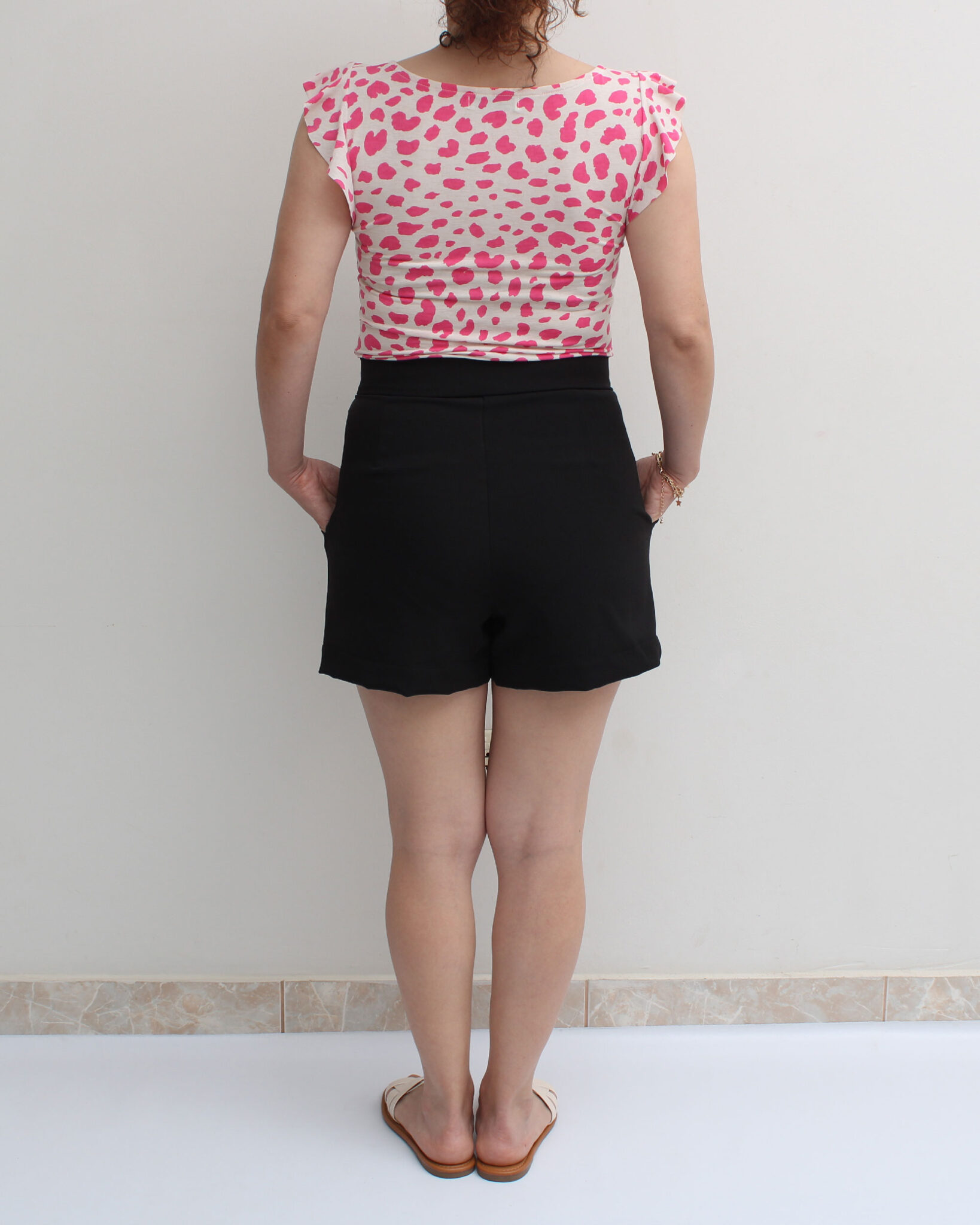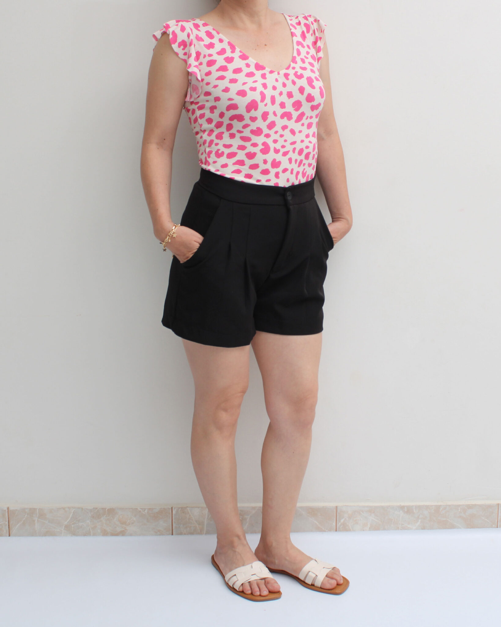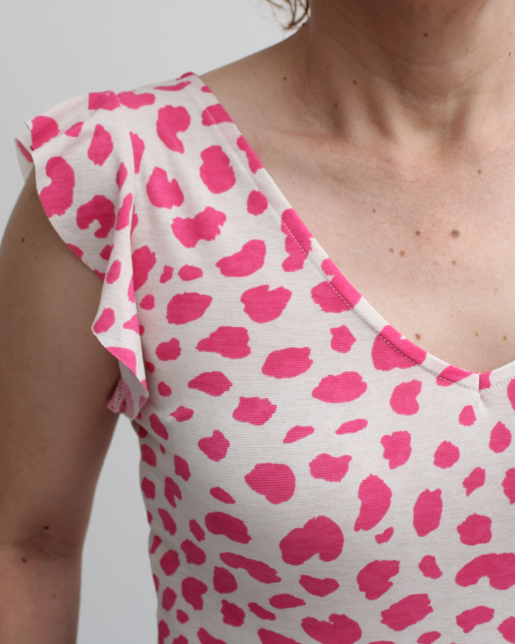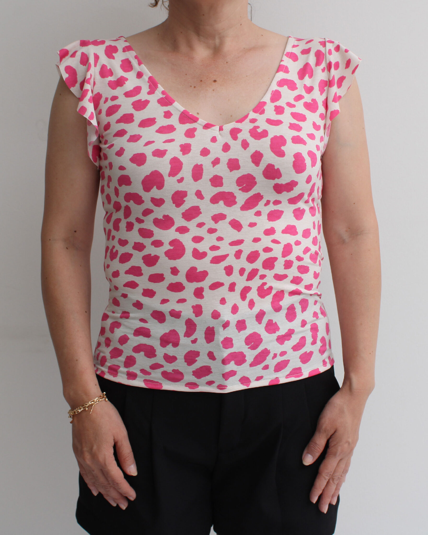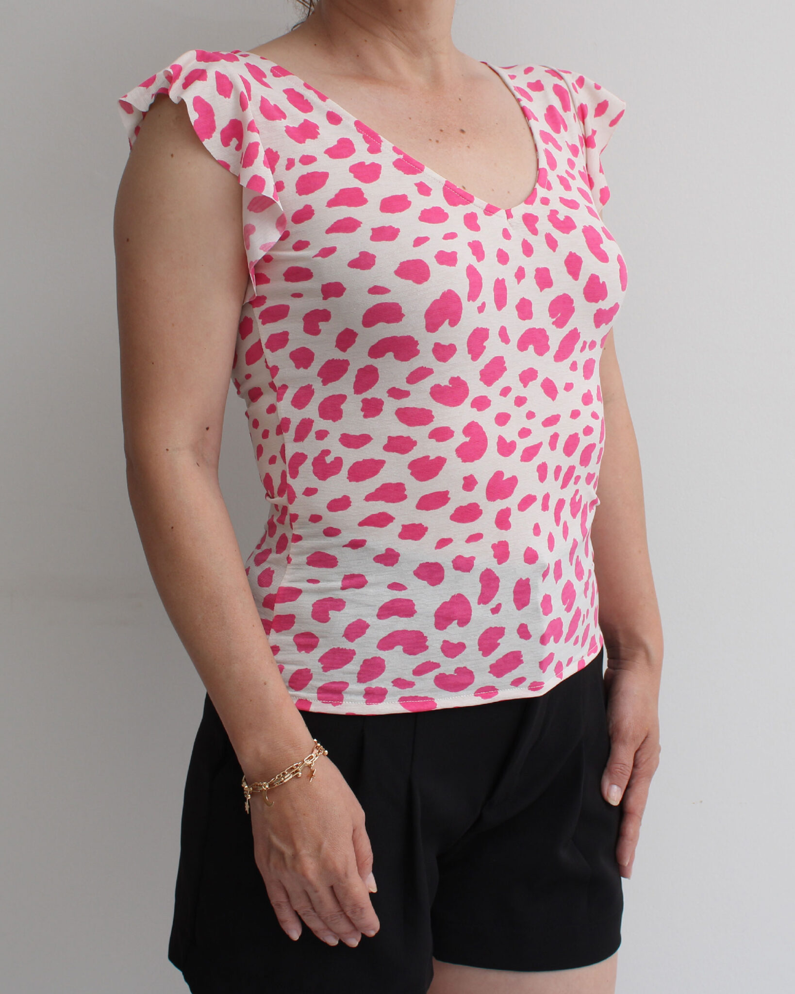 • Modelo manga con vuelos en el contorno, cuello V. Esta prenda es entallada.