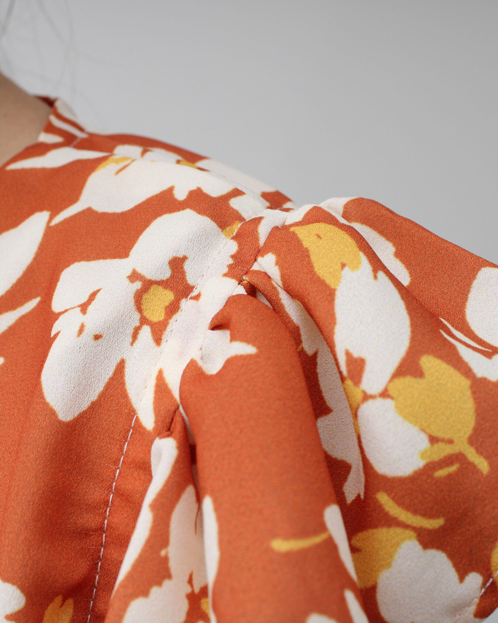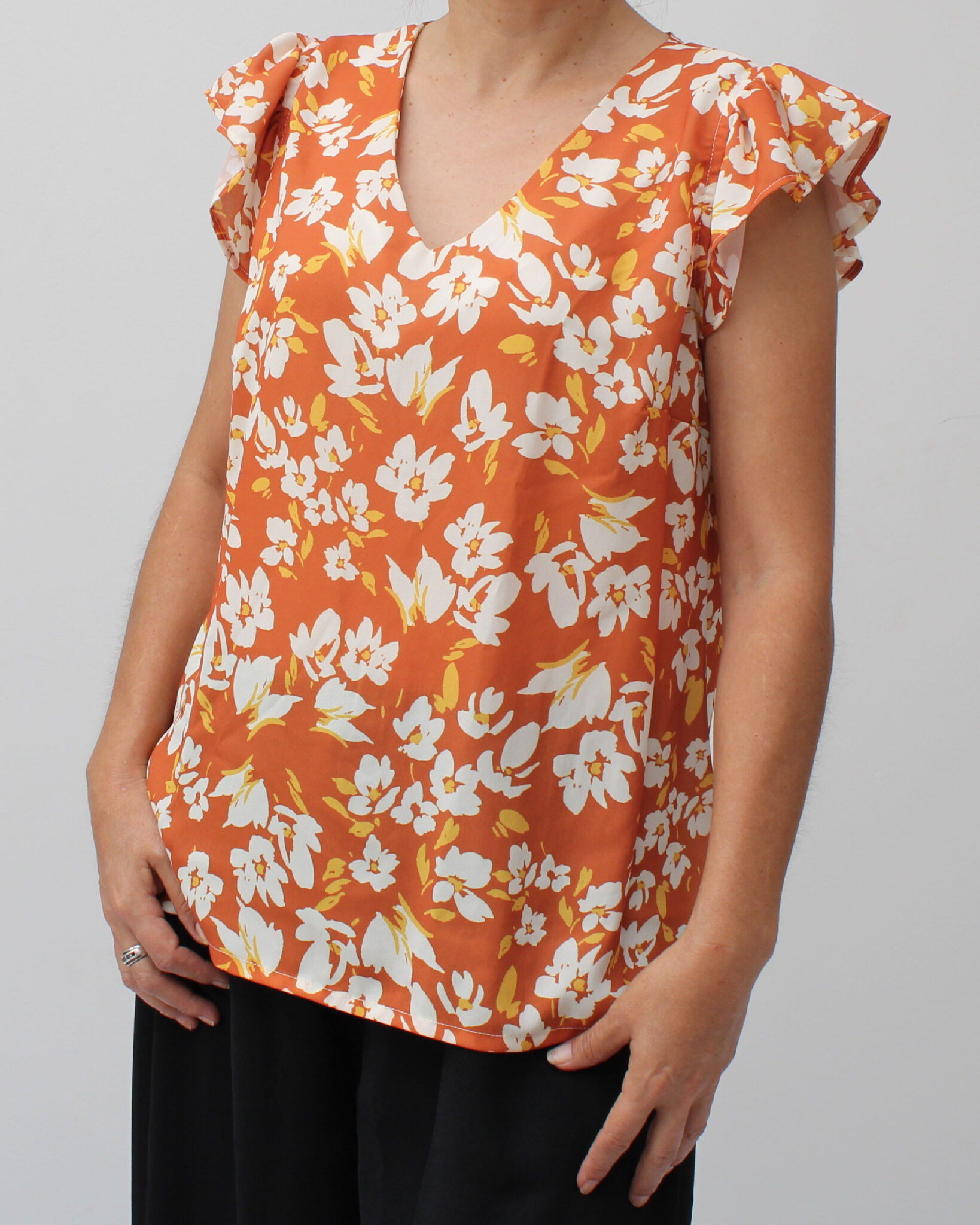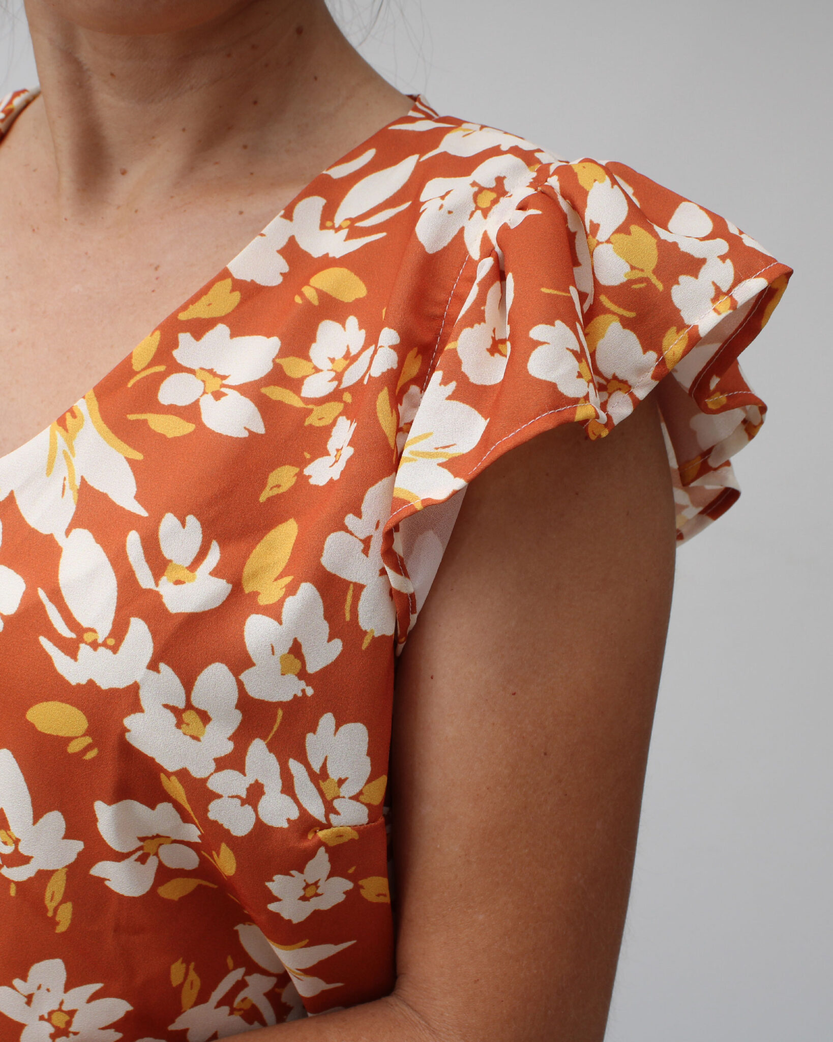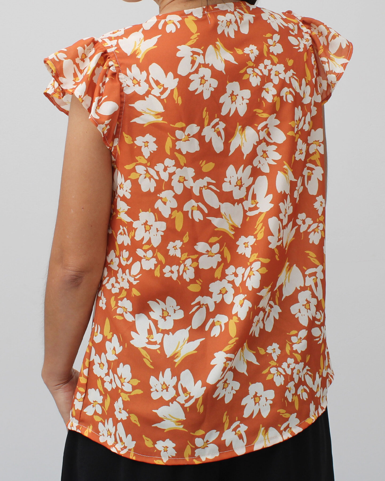 Modelo suelto con pinza en el busto para mejor entalle, cuello V en la parte delantera y cerrado en la parte posterior, manga cero con contorno con vuelo fruncido.