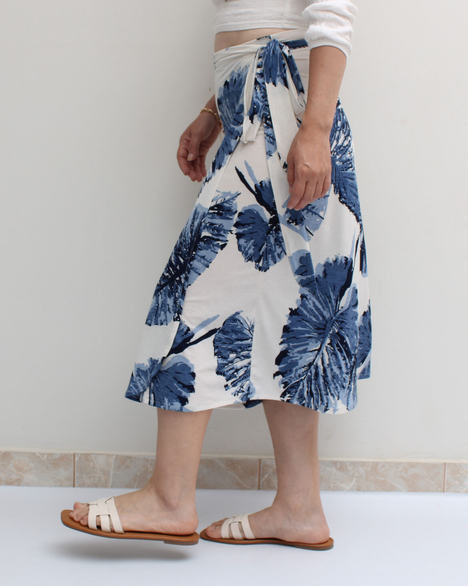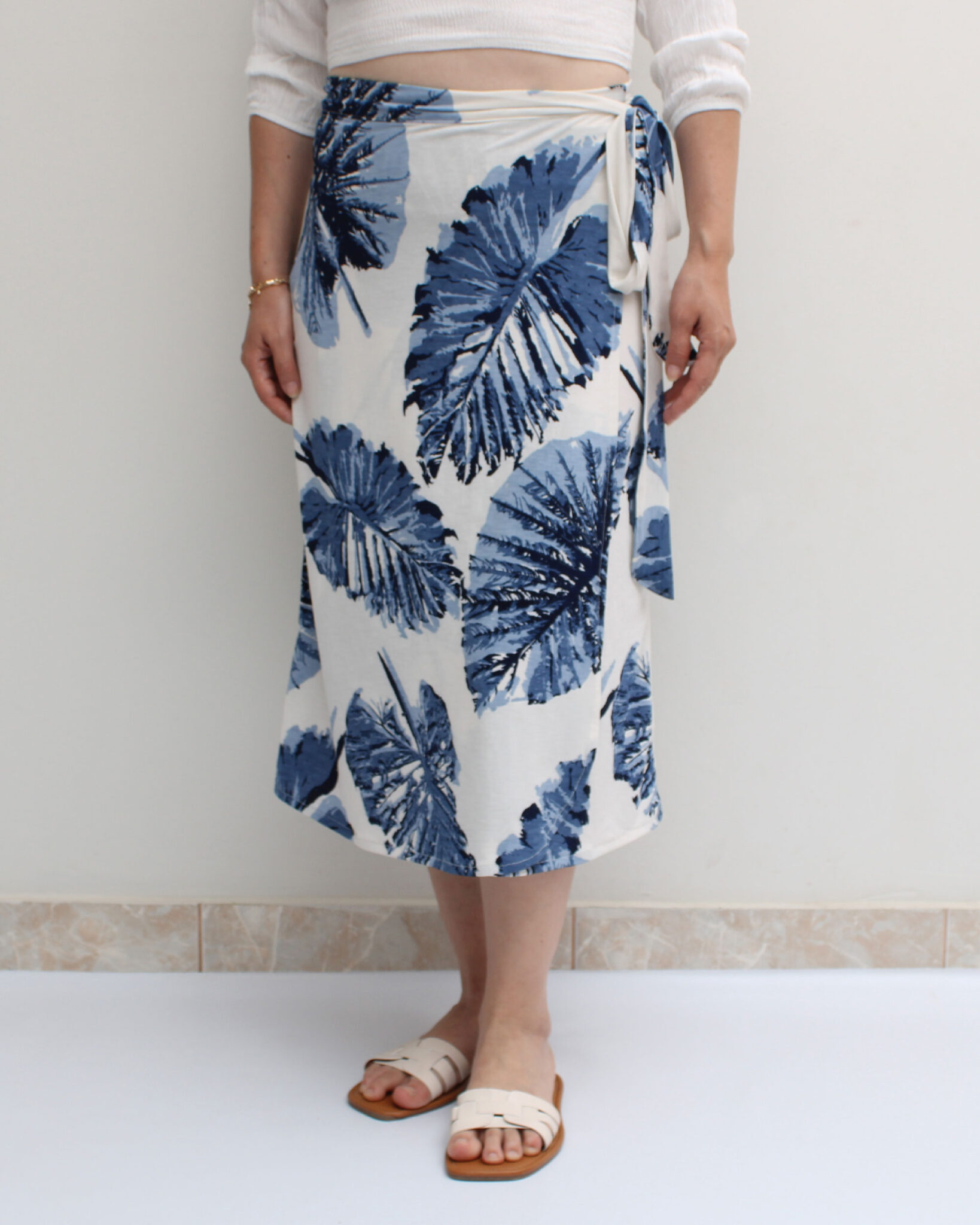 Hecho con licra venecia, en crema estampado en tonos azules.