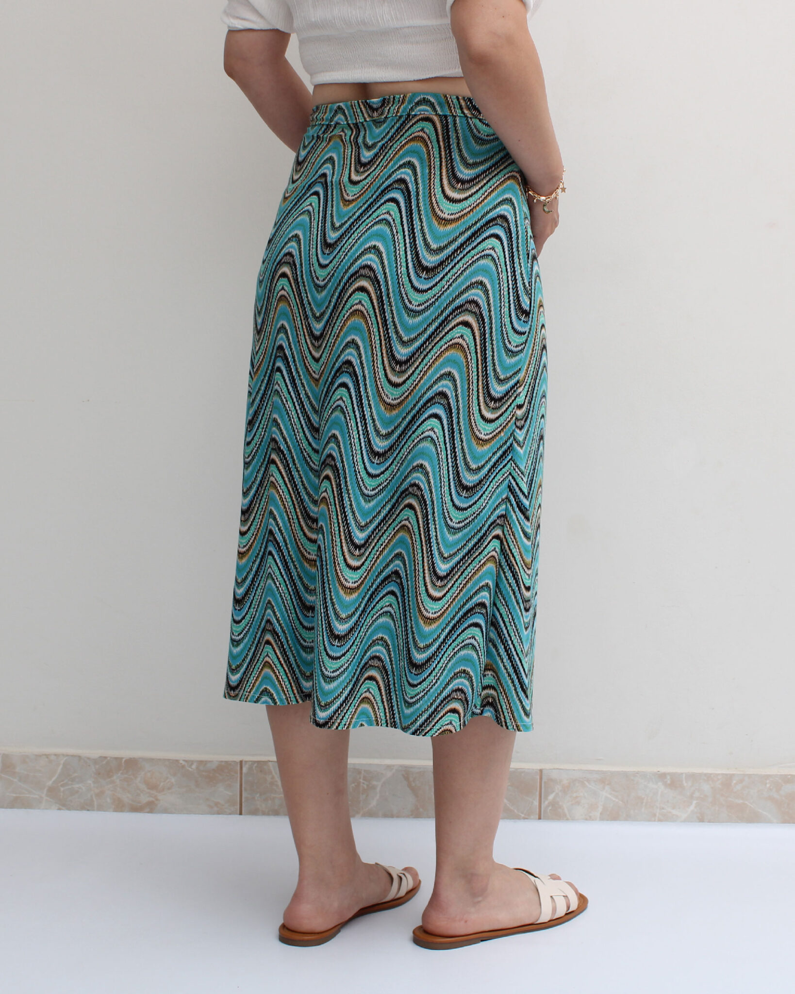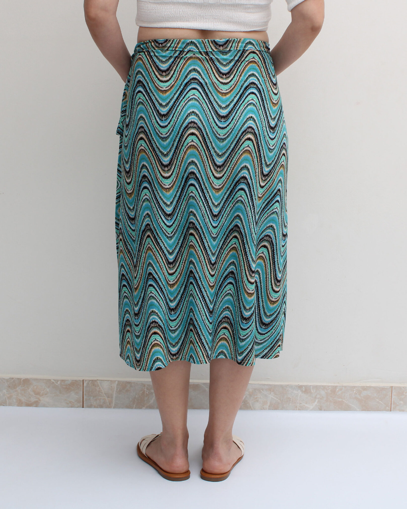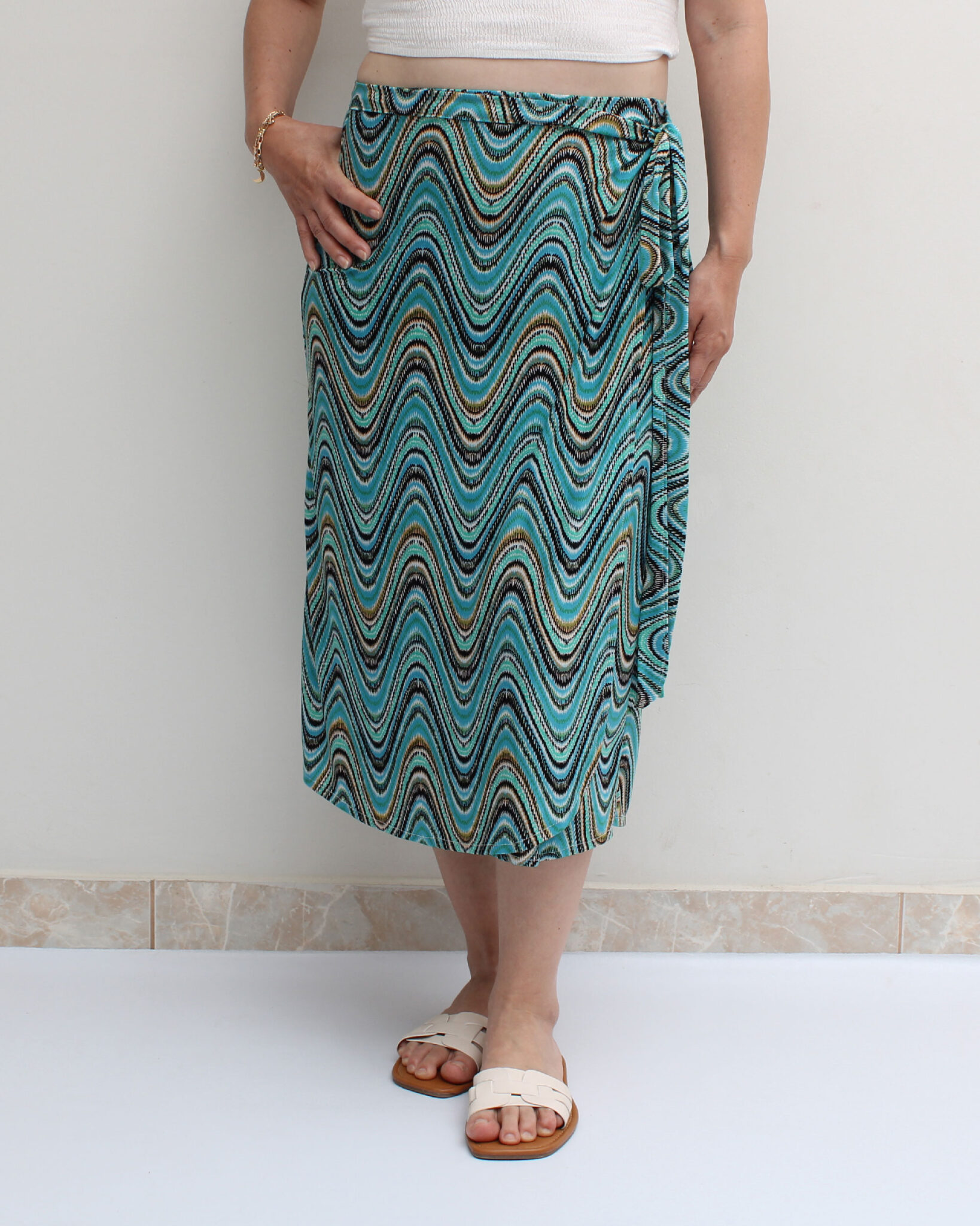 Falda envolvente en licra venecia estampada en tonos verdes.