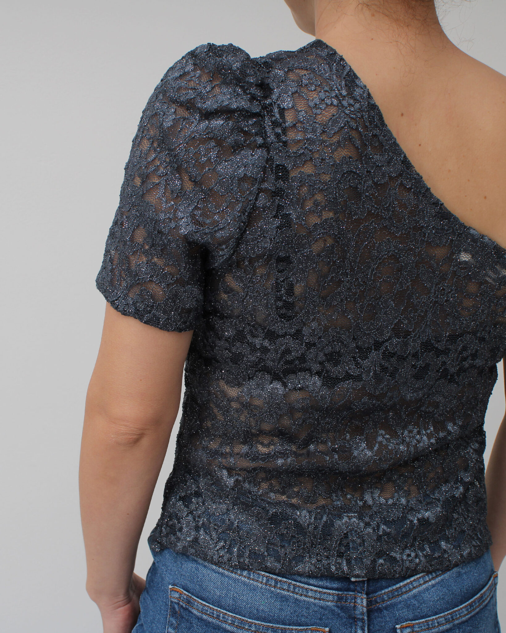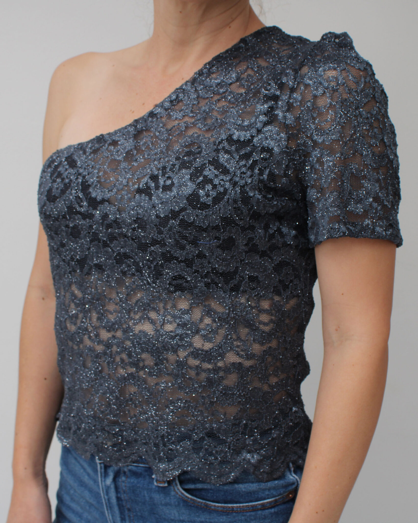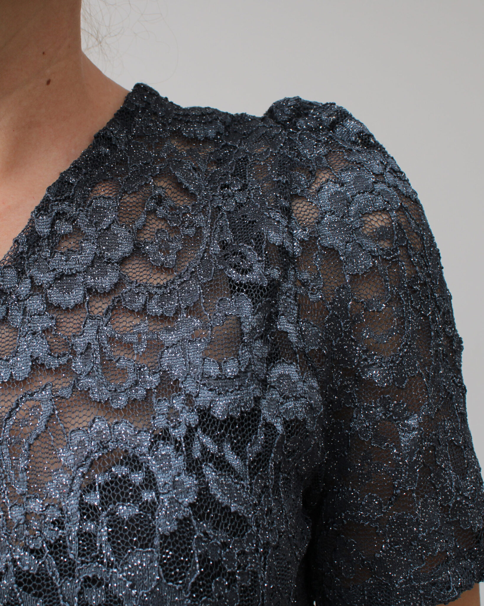 - Hecho de encaje gris salpicado con escarcha plateada, la tela tiene propiedades elásticas, 90% poliéster y 10% elastano.