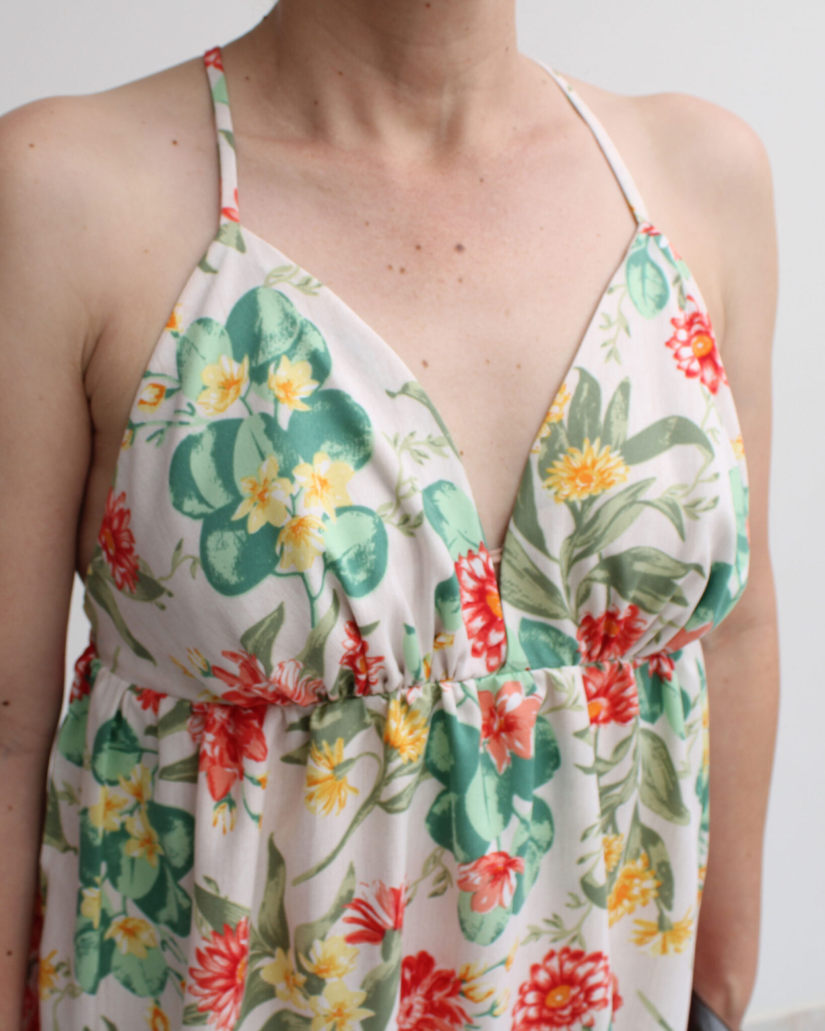 • Las copas son forradas y debajo del busto se extiende la falda fruncida, con elástico en la espalda, tiras regulables.