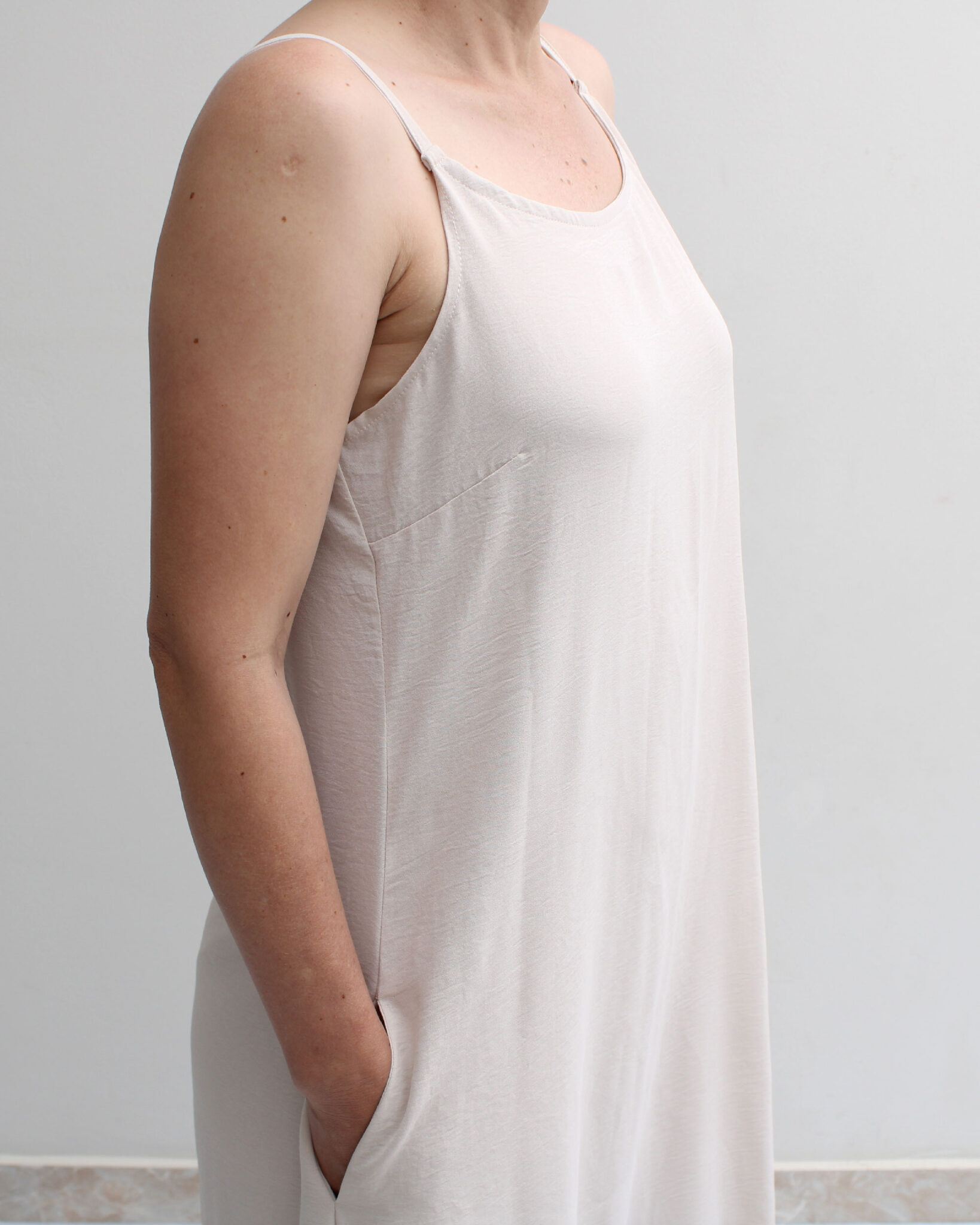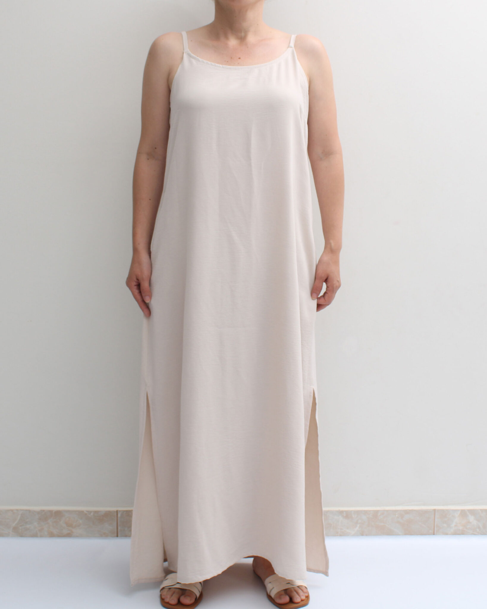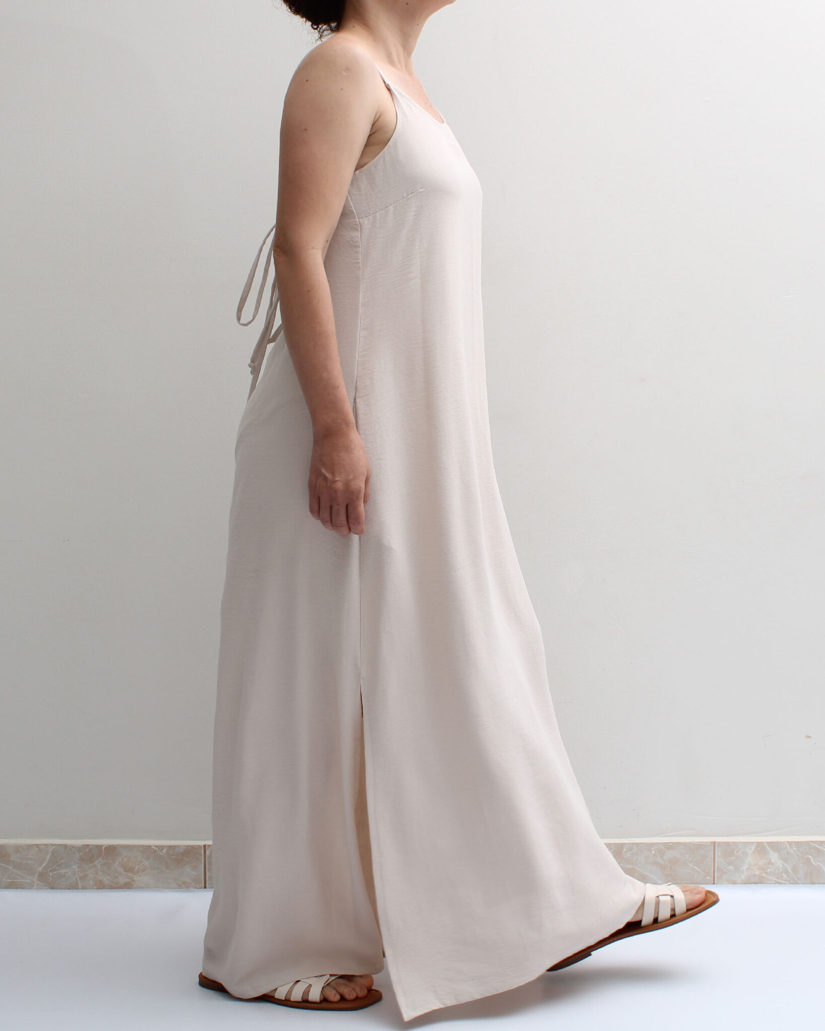 • Modelo corte A amplio con abertura a ambos lados de la falda, las tiras se regulan y se ajustan con lazo en la espalda.