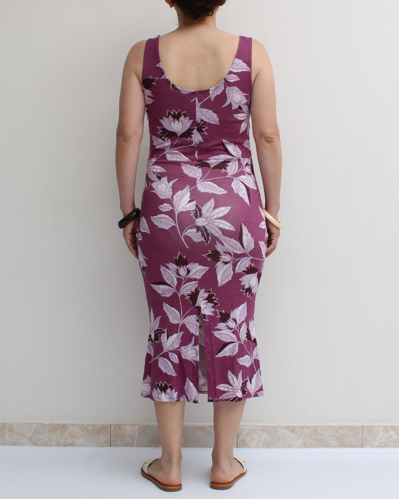 Modelo corte sirena, cuello redondo y manga cero, abertura en la falda en la parte posterior.